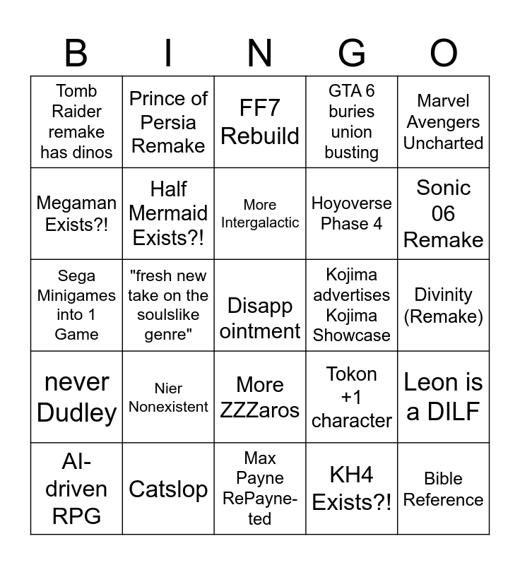 This bingo card has a free space and 24 words: Nier Nonexistent, Catslop, More Intergalactic, AI-driven RPG, Marvel Avengers Uncharted, Tomb Raider remake has dinos, Megaman Exists?!, Prince of Persia Remake, Kojima advertises Kojima Showcase, More ZZZaros, Hoyoverse Phase 4, Sega Minigames into 1 Game, Tokon +1 character, Leon is a DILF, Half Mermaid Exists?!, KH4 Exists?!, Divinity (Remake), FF7 Rebuild, Sonic 06 Remake, "fresh new take on the soulslike genre", Bible Reference, never Dudley, GTA 6 buries union busting and Max Payne RePayne-ted.