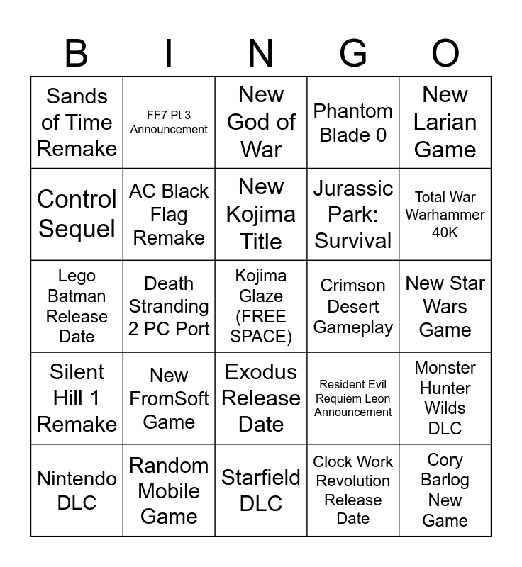 This bingo card has a free space and 24 words: New FromSoft Game, Random Mobile Game, New Kojima Title, Nintendo DLC, New Larian Game, Sands of Time Remake, Control Sequel, FF7 Pt 3 Announcement, Crimson Desert Gameplay, Exodus Release Date, Jurassic Park: Survival, Lego Batman Release Date, Resident Evil Requiem Leon Announcement, Monster Hunter Wilds DLC, AC Black Flag Remake, Clock Work Revolution Release Date, New Star Wars Game, New God of War, Total War Warhammer 40K, Death Stranding 2 PC Port, Cory Barlog New Game, Silent Hill 1 Remake, Phantom Blade 0 and Starfield DLC.