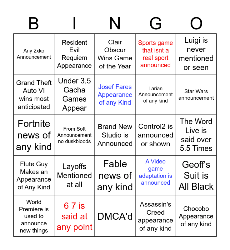 This bingo card has 25 words: Layoffs Mentioned at all, DMCA'd, Josef Fares Appearance of any Kind, World Premiere is used to announce new things, Luigi is never mentioned or seen, Any 2xko Announcement, Grand Theft Auto VI wins most anticipated, Resident Evil Requiem Appearance, Control2 is announced or shown, Fable news of any kind, Larian Announcement of any kind, Fortnite news of any kind, A Video game adaptation is announced, Geoff's Suit is All Black, Under 3.5 Gacha Games Appear, Chocobo Appearance of any kind, The Word Live is said over 5.5 Times, Clair Obscur Wins Game of the Year, Star Wars announcement, From Soft Announcement no duskbloods, Brand New Studio is Announced, 6 7 is said at any point, Flute Guy Makes an Appearance of Any Kind, Sports game that isnt a real sport announced and Assassin's Creed appearance of any kind.