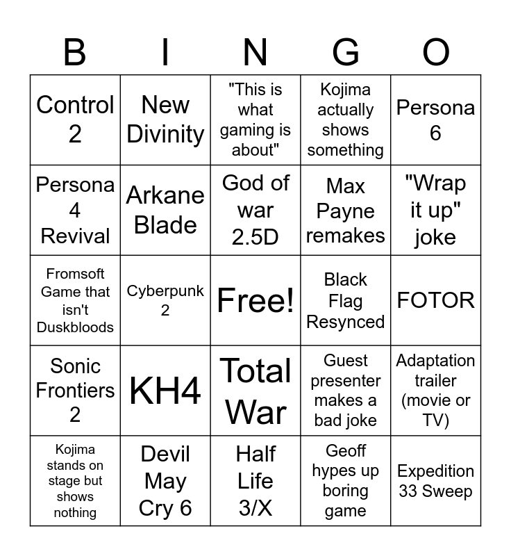 This bingo card has a free space and 24 words: KH4, Devil May Cry 6, God of war 2.5D, Kojima stands on stage but shows nothing, Persona 6, Control 2, Persona 4 Revival, New Divinity, Black Flag Resynced, Total War, Max Payne remakes, Fromsoft Game that isn't Duskbloods, Guest presenter makes a bad joke, Adaptation trailer (movie or TV), Arkane Blade, Geoff hypes up boring game, FOTOR, "This is what gaming is about", "Wrap it up" joke, Cyberpunk 2, Expedition 33 Sweep, Sonic Frontiers 2, Kojima actually shows something and Half Life 3/X.
