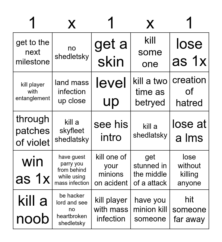 This bingo card has a free space and 24 words: have guest parry you from behind while using mass infection, be hacker lord and see no heartbroken shedletsky, level up, kill a noob, lose as 1x, get to the next milestone, kill player with entanglement, no shedletsky, kill a shedlatsky, kill one of your minions on acident, kill a two time as betryed, through patches of violet, get stunned in the middle of a attack, lose without killing anyone, land mass infection up close, have you minion kill someone, lose at a lms, get a skin, creation of hatred, kill a skyfleet shedlatsky, hit someone far away, win as 1x, kill some one and kill player with mass infection.