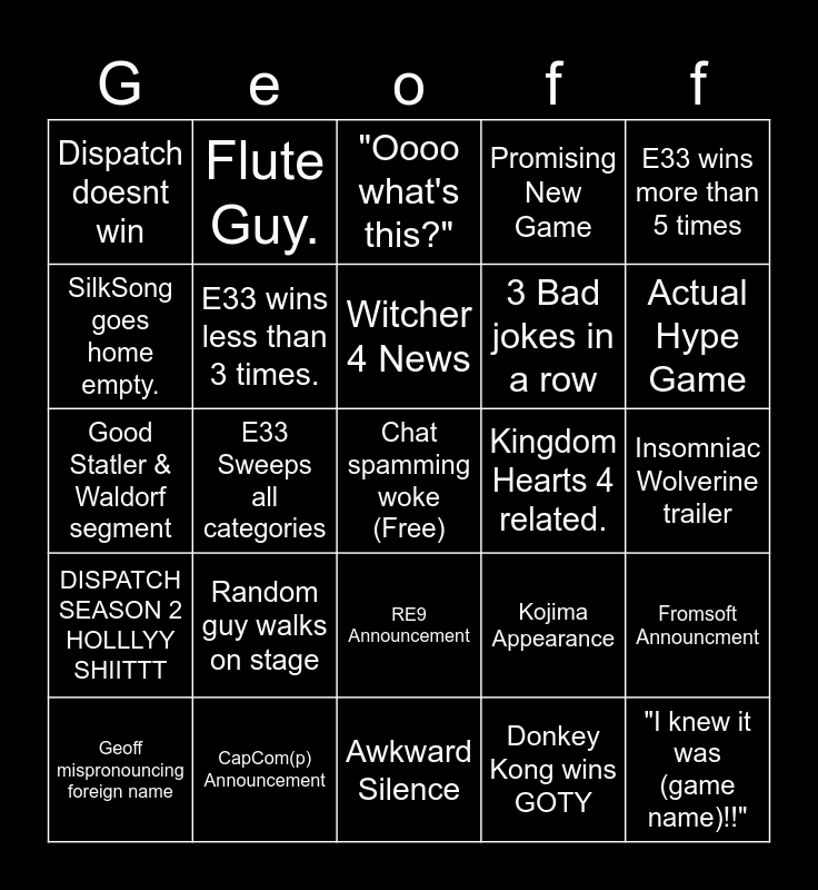 This bingo card has a free space and 24 words: Random guy walks on stage, CapCom(p) Announcement, Witcher 4 News, Geoff mispronouncing foreign name, E33 wins more than 5 times, Dispatch doesnt win, SilkSong goes home empty., Flute Guy., Kingdom Hearts 4 related., RE9 Announcement, 3 Bad jokes in a row, Good Statler & Waldorf segment, Kojima Appearance, Fromsoft Announcment, E33 wins less than 3 times., Donkey Kong wins GOTY, Insomniac Wolverine trailer, "Oooo what's this?", Actual Hype Game, E33 Sweeps all categories, "I knew it was (game name)!!", DISPATCH SEASON 2 HOLLLYY SHIITTT, Promising New Game and Awkward Silence.