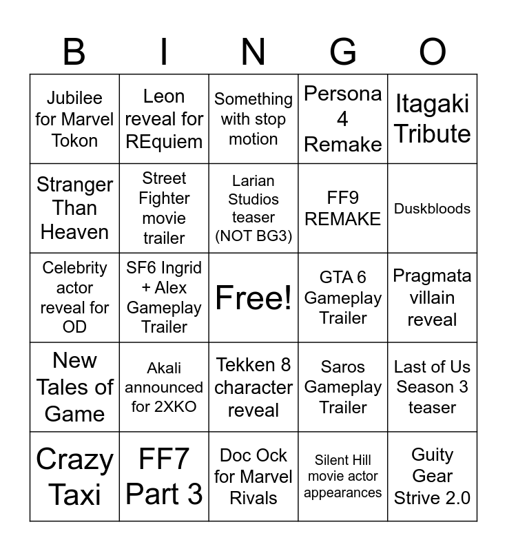 This bingo card has a free space and 24 words: Akali announced for 2XKO, FF7 Part 3, Larian Studios teaser (NOT BG3), Crazy Taxi, Itagaki Tribute, Jubilee for Marvel Tokon, Stranger Than Heaven, Leon reveal for REquiem, GTA 6 Gameplay Trailer, Tekken 8 character reveal, FF9 REMAKE, Celebrity actor reveal for OD, Saros Gameplay Trailer, Last of Us Season 3 teaser, Street Fighter movie trailer, Silent Hill movie actor appearances, Pragmata villain reveal, Something with stop motion, Duskbloods, SF6 Ingrid + Alex Gameplay Trailer, Guity Gear Strive 2.0, New Tales of Game, Persona 4 Remake and Doc Ock for Marvel Rivals.