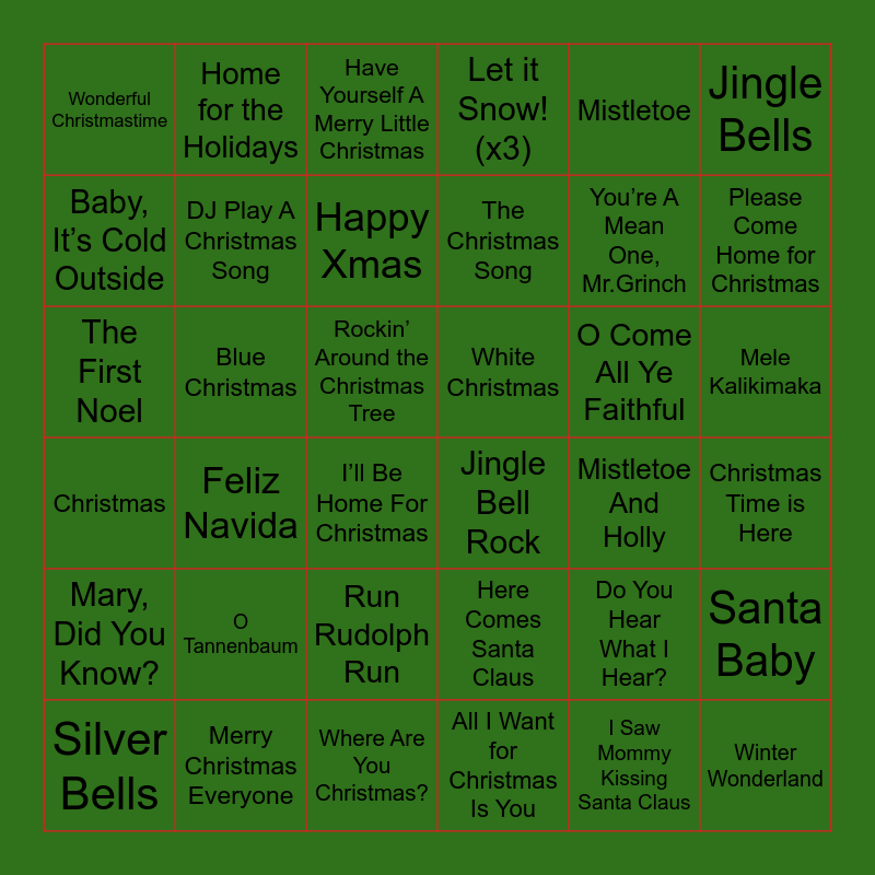 This bingo card has 70 words: Last Christmas, Rockin’ Around the Christmas Tree, Underneath the Tree, All I Want for Christmas Is You, Jingle Bell Rock, Santa Tell Me, Let it Snow! (x3), It’s the Most Wonderful Time of the Year, Mistletoe, Carol of the Bells, Feliz Navida, Sleigh Ride, Wonderful Christmastime, Have Yourself A Merry Little Christmas, Santa Claus Is Comin’ to Town, Please Come Home for Christmas, Mele Kalikimaka, Happy Xmas, Little Saint Nick, White Christmas, Blue Christmas, Christmas, The Christmas Song, Run Rudolph Run, Santa Baby, A Holly Jolly Christmas, It’s Beginning to Look A Lot Like Christmas, Rudolph The Red-Nosed Reindeer, Christmas Time is Here, A Marshmallow World, Home for the Holidays, Hallelujah, Christmas Tree Farm, Merry Christmas, Where Are You Christmas?, Merry Christmas Everyone, Do They Know It’s Christmas?, Thank God It’s Christmas, Do You Hear What I Hear?, Jingle Bells, Mary, Did You Know?, O Come All Ye Faithful, The First Noel, The Little Drummer Boy, Frosty the Snowman, Baby, It’s Cold Outside, I’ll Be Home For Christmas, I Saw Mommy Kissing Santa Claus, Dance of the Sugar Plum Fairy, Winter Wonderland, The Chanukah Song, Christmas Must Be Something More, Here Comes Santa Claus, Silver Bells, Mistletoe And Holly, O Holy Night, DJ Play A Christmas Song, Someday At Christmas, Joy To the World, O Tannenbaum, You’re A Mean One, Mr.Grinch, God Rest Ye Merry Gentlemen, Pennies From Heaven, The Chipmuck Song, What Christmas Means To Me, Deck The Hall, Step Into Christmas, Happy Holiday, Merry Christmas, Happy Holidays and Hark! The Heralds Angels Sing.