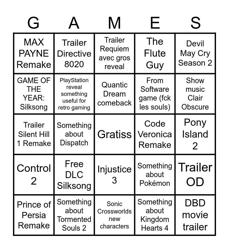 This bingo card has a free space and 24 words: Free DLC Silksong, Something about Tormented Souls 2, Quantic Dream comeback, Prince of Persia Remake, Devil May Cry Season 2, MAX PAYNE Remake, GAME OF THE YEAR: Silksong, Trailer Directive 8020, Code Veronica Remake, Injustice 3, From Software game (fck les souls), Trailer Silent Hill 1 Remake, Something about Pokémon, Trailer OD, PlayStation reveal something useful for retro gaming, Something about Kingdom Hearts 4, Pony Island 2, Trailer Requiem avec gros reveal, Show music Clair Obscure, Something about Dispatch, DBD movie trailer, Control 2, The Flute Guy and Sonic Crossworlds new characters.