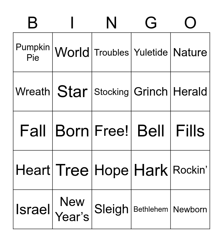 This bingo card has a free space and 44 words: Glory, Newborn, Heaven, Israel, Home, Bethlehem, Troubles, Rejoice, Nature, New Year’s, Yuletide, Bell, Hope, Tree, Frosty, Sleigh, Tears, Fall, Mistletoe, Herald, World, Carols, Special, Pumpkin Pie, Found, Fills, Jingle, Merry, Hark, Heart, Fade, Rockin’, Immanuel, Hope, Born, Exile, Little, Earth, Stocking, Wreath, Grinch, Jesus, Star and Snow.