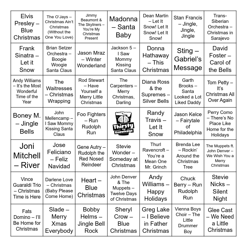 This bingo card has a free space and 100 words: Alvin and the Chipmunks – The Chipmunk Song, Andy Williams – Happy Holidays, Andy Williams – It’s the Most Wonderful Time of the Year, Aretha Franklin – O Christmas Tree, B.B. King – Merry Christmas Baby, Barenaked Ladies – Do They Know It’s Christmas?, Bette Midler – White Christmas, Bing Crosby – White Christmas, Bob Rivers – 12 Pains of Christmas, Bob Rivers – It’s the Most Fattening Time of the Year, Bob Rivers – The “What’s It to Ya” Chorus, Bob Rivers – Walkin’ ‘Round in Women’s Underwear, Bobby Helms – Jingle Bell Rock, Boney M. – Jingle Bells, Boyz II Men – The Birth of Christ, Brenda Lee – Rockin’ Around the Christmas Tree, Brian Setzer Orchestra – Boogie Woogie Santa Claus, Bruce Springsteen – Santa Claus is Coming to Town, Bryan Adams – Something About Christmas Time, Burl Ives – A Holly Jolly Christmas, Burl Ives – Silver and Gold, Celtic Women – O Holy Night, Chuck Berry – Run Rudolph Run, Cyndi Lauper – Santa Claus is Coming to Town, Darlene Love – Christmas (Baby Please Come Home), David Foster – Carol of the Bells, Dean Martin – Let It Snow! Let It Snow! Let It Snow!, Diana Ross & the Supremes – Silver Bells, Dolly Parton – Hard Candy Christmas, Dolly Parton – I Believe in Santa Claus, Donna Hathaway – This Christmas, Elvis Presley – Blue Christmas, Elvis Presley – Santa Bring My Baby (Back to Me), Fats Domino – I’ll Be Home for Christmas, Foo Fighters – Run Rudolph Run, Frank Sinatra – Let it Snow, Garth Brooks – Santa Looked a Lot Liked Daddy, Gayla Peevey – I Want a Hippopotamus for Christmas, Gene Autry – Rudolph the Red Nosed Reindeer, Glee Cast – We Need a Little Christmas, Greg Lake – I Believe in Father Christmas, Heart – Blue Christmas, Jackson 5 – I Saw Mommy Kissing Santa Claus, Jason Kelce – Fairytale of Philadelphia, Jason Mraz – Winter Wonderland, Jimmy Beaumont & The Skyliners – You’re My Christmas Present, Jimmy Buffet – Mele Kalikimaka, John Denver & The Muppets – Twelve Days of Christmas, John Lennon – Happy Xmas (War is Over), John Mellencamp – I Saw Mommy Kissing Santa Claus, Jon Bon Jovi – Please Come Home for Christmas, Joni Mitchell – River, Jose Feliciano – Feliz Navidad, Josh Groban – O Holy Night, Justin Bieber – Mistletoe, Justin Bieber ft. Usher – The Christmas Song, Lou Monte – Dominick the Donkey, Louis Armstrong – ‘Zat You, Santa Claus?, Louis Armstrong & Ella Fitzgerald – Baby, It’s Cold Outside, Madonna – Santa Baby, Manheim Steamroller – Deck the Halls, Manheim Steamroller – God Rest Ye, Merry Gentlemen, Mariah Carey – All I Want for Christmas is You, Michael Bublé – It’s Beginning to Look a Lot Like Christmas, Nat King Cole – The Christmas Song, NSYNC – Merry Christmas, Happy Holidays, Paul McCartney – Wonderful Christmastime, Perry Como – There’s No Place Like Home for the Holidays, Queen – Jingle Bells, Queen – Thank God It’s Christmas, Randy Travis – Let It Snow, Rod Stewart – Have Yourself a Merry Little Christmas, Roy Orbison – Pretty Paper, Run DMC – Christmas in Hollis, Sheryl Crow – Blue Christmas, Slade – Merry Xmas Everybody, Spike Jones – All I Want for Christmas (Is My Two Front Teeth), Stan Francis – Jingle, Jingle, Jingle, Stevie Nicks – Silent Night, Stevie Wonder – Someday at Christmas, Stevie Wonder – What Christmas Means to Me, Sting – Gabriel’s Message, The Beach Boys – Little St. Nick, The Carpenters – Merry Christmas, Darling, The Muppets ft. John Denver – We Wish You a Merry Christmas, The O’Jays – Christmas Ain’t Christmas (Without the One You Love), The Pretenders – 2,000 Miles, The Ronettes – Sleigh Ride, The Temptations – Silent Night, The Waitresses – Christmas Wrapping, Thurl Ravencroft – You’re a Mean One Mr. Grinch, Tom Hanks – Hot Chocolate, Tom Hanks – The Polar Express, Tom Petty – It’s Christmas All Over Again, Trans-Siberian Orchestra – Christmas in Sarajevo, Vanessa Williams – What Child is This?, Vienna Boys Choir – The Little Drummer Boy, Vince Guaraldi Trio – Christmas Time is Here, Vince Guaraldi Trio – Linus and Lucy and Wham! – Last Christmas.