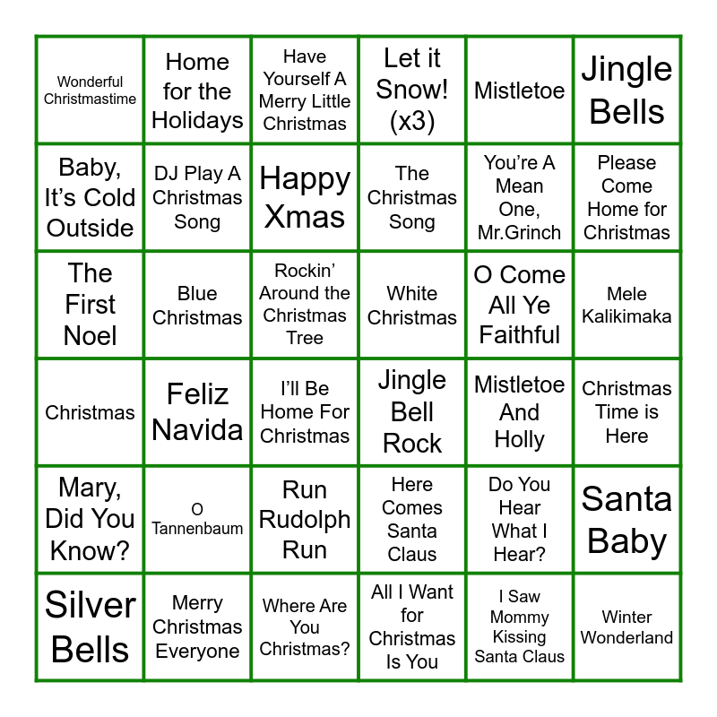 This bingo card has 70 words: Last Christmas, Rockin’ Around the Christmas Tree, Underneath the Tree, All I Want for Christmas Is You, Jingle Bell Rock, Santa Tell Me, Let it Snow! (x3), It’s the Most Wonderful Time of the Year, Mistletoe, Carol of the Bells, Feliz Navida, Sleigh Ride, Wonderful Christmastime, Have Yourself A Merry Little Christmas, Santa Claus Is Comin’ to Town, Please Come Home for Christmas, Mele Kalikimaka, Happy Xmas, Little Saint Nick, White Christmas, Blue Christmas, Christmas, The Christmas Song, Run Rudolph Run, Santa Baby, A Holly Jolly Christmas, It’s Beginning to Look A Lot Like Christmas, Rudolph The Red-Nosed Reindeer, Christmas Time is Here, A Marshmallow World, Home for the Holidays, Hallelujah, Christmas Tree Farm, Merry Christmas, Where Are You Christmas?, Merry Christmas Everyone, Do They Know It’s Christmas?, Thank God It’s Christmas, Do You Hear What I Hear?, Jingle Bells, Mary, Did You Know?, O Come All Ye Faithful, The First Noel, The Little Drummer Boy, Frosty the Snowman, Baby, It’s Cold Outside, I’ll Be Home For Christmas, I Saw Mommy Kissing Santa Claus, Dance of the Sugar Plum Fairy, Winter Wonderland, The Chanukah Song, Christmas Must Be Something More, Here Comes Santa Claus, Silver Bells, Mistletoe And Holly, O Holy Night, DJ Play A Christmas Song, Someday At Christmas, Joy To the World, O Tannenbaum, You’re A Mean One, Mr.Grinch, God Rest Ye Merry Gentlemen, Pennies From Heaven, The Chipmuck Song, What Christmas Means To Me, Deck The Hall, Step Into Christmas, Happy Holiday, Merry Christmas, Happy Holidays and Hark! The Heralds Angels Sing.