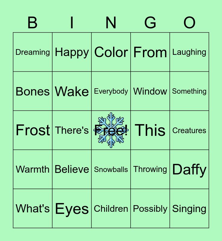 This bingo card has a free space and 29 words: What's, Air, There's, Jack, Dreaming, Color, Wake, Believe, This, Eyes, Creatures, Singing, Children, Possibly, Something, Toys, Snowballs, Warmth, Laughing, Frost, Throwing, Instead, Window, Bones, From, Happy, Daffy, Everybody and Fair.