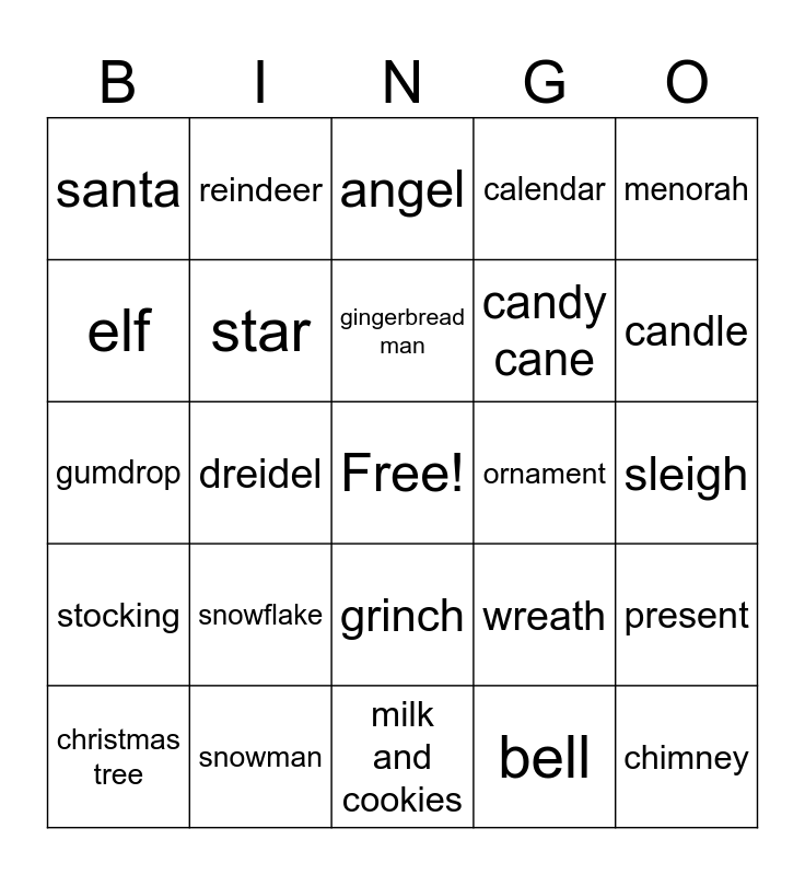 This bingo card has a free space and 24 words: snowflake, snowman, gingerbread man, christmas tree, menorah, santa, elf, reindeer, ornament, grinch, candy cane, gumdrop, wreath, present, star, bell, sleigh, angel, candle, dreidel, chimney, stocking, calendar and milk and cookies.