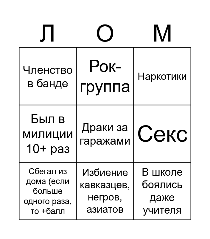 This bingo card has a free space and 8 words: Секс, Наркотики, Рок-группа, Сбегал из дома (если больше одного раза, то +балл, Членство в банде, В школе боялись даже учителя, Был в милиции 10+ раз and Избиение кавказцев, негров, азиатов.