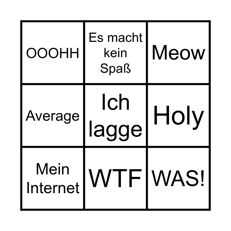 This bingo card has a free space and 8 words: Holy, Meow, Es macht kein Spaß, Mein Internet, OOOHH, WAS!, Average and WTF.