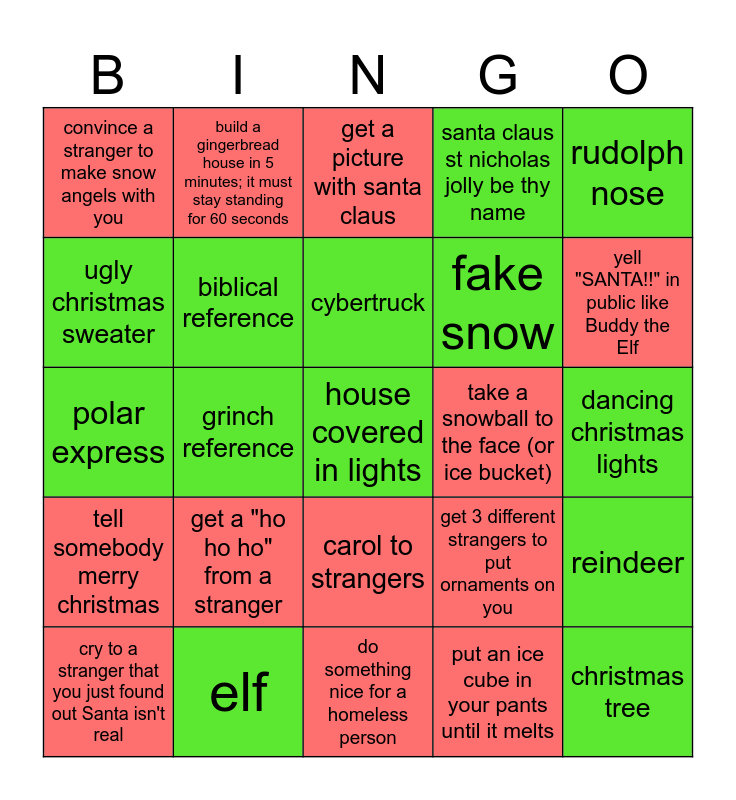 This bingo card has a free space and 37 words: inflatable character dressed like santa, candy cane, snowman, biblical reference, reindeer, get a "ho ho ho" from a stranger, cybertruck, car with antlers, rudolph nose, christmas lights on a car, grinch reference, santa claus st nicholas jolly be thy name, christmas tree, dancing christmas lights, ugly christmas sweater, tell somebody merry christmas, finish a large holiday themed DQ blizzard, get a picture with santa claus, carol to strangers, take a snowball to the face (or ice bucket), convince a stranger to make snow angels with you, yell "SANTA!!" in public like Buddy the Elf, cry to a stranger that you just found out Santa isn't real, do something nice for a homeless person, Eat 3 cookies and a glass of milk within 3 minutes, put an ice cube in your pants until it melts, build a gingerbread house in 5 minutes; it must stay standing for 60 seconds, go to a drive thru, order the same thing as the person ahead of you, finish that meal, call a pizza place and ask if they deliver to the North Pole, call random #, don't hang up until they wish you Merry Christmas without saying either word, chug a glass of hot sauce egg nog, elf, polar express, nutcracker, get 3 different strangers to put ornaments on you, fake snow and ai generated decoration.