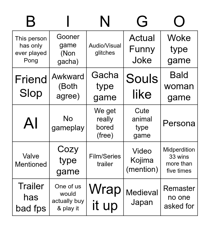 This bingo card has a free space and 24 words: Cozy type game, One of us would actually buy & play it, Gacha type game, Trailer has bad fps, Woke type game, This person has only ever played Pong, Friend Slop, Gooner game (Non gacha), Cute animal type game, Film/Series trailer, Souls like, AI, Video Kojima (mention), Midperdition 33 wins more than five times, Awkward (Both agree), Medieval Japan, Persona, Audio/Visual glitches, Bald woman game, No gameplay, Remaster no one asked for, Valve Mentioned, Actual Funny Joke and Wrap it up.