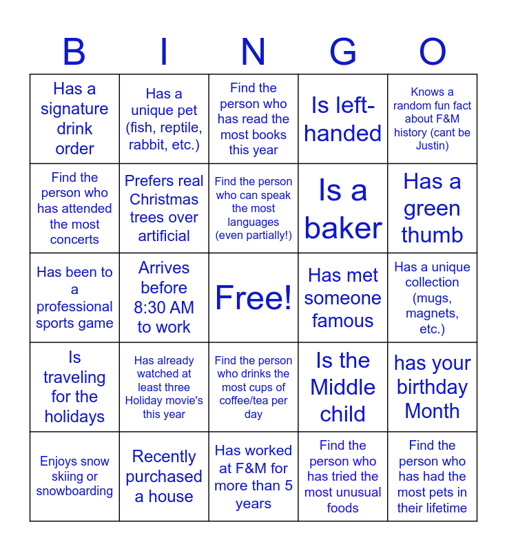 This bingo card has a free space and 24 words: Has already watched at least three Holiday movie's this year, Recently purchased a house, Find the person who can speak the most languages (even partially!), Enjoys snow skiing or snowboarding, Knows a random fun fact about F&M history (cant be Justin), Has a signature drink order, Find the person who has attended the most concerts, Has a unique pet (fish, reptile, rabbit, etc.), Has met someone famous, Find the person who drinks the most cups of coffee/tea per day, Is a baker, Has been to a professional sports game, Is the Middle child, has your birthday Month, Prefers real Christmas trees over artificial, Find the person who has tried the most unusual foods, Has a unique collection (mugs, magnets, etc.), Find the person who has read the most books this year, Has a green thumb, Arrives before 8:30 AM to work, Find the person who has had the most pets in their lifetime, Is traveling for the holidays, Is left-handed and Has worked at F&M for more than 5 years.