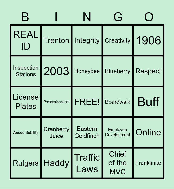 This bingo card has a free space and 24 words: Cranberry Juice, Haddy, Honeybee, Rutgers, 1906, REAL ID, Inspection Stations, Trenton, Boardwalk, Eastern Goldfinch, Blueberry, License Plates, Employee Development, Online, 2003, Chief of the MVC, Buff, Integrity, Respect, Professionalism, Franklinite, Accountability, Creativity and Traffic Laws.