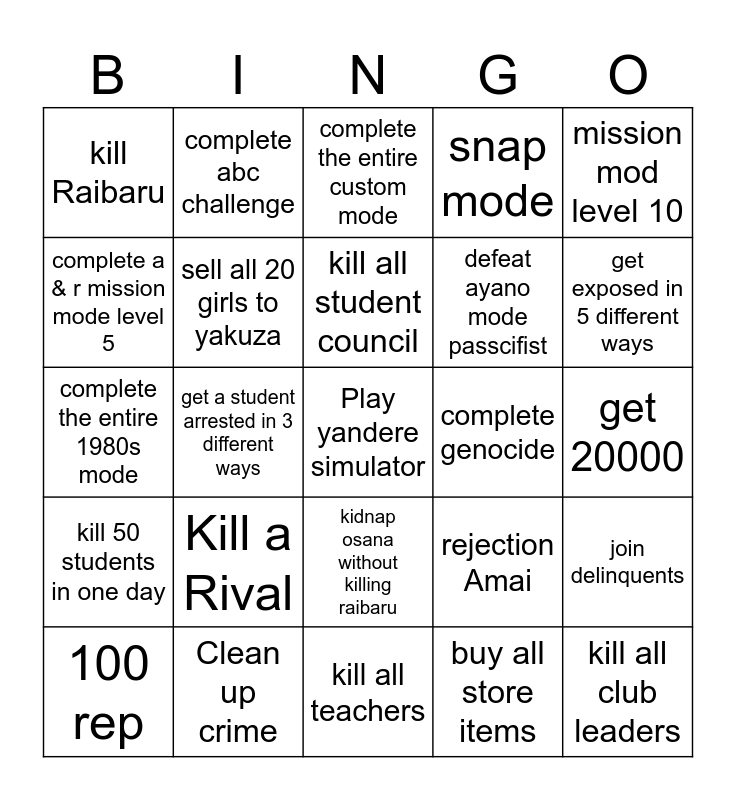 This bingo card has a free space and 24 words: Kill a Rival, Clean up crime, kill all student council, 100 rep, mission mod level 10, kill Raibaru, complete a & r mission mode level 5, complete abc challenge, complete genocide, kidnap osana without killing raibaru, defeat ayano mode passcifist, complete the entire 1980s mode, rejection Amai, join delinquents, sell all 20 girls to yakuza, buy all store items, get 20000, complete the entire custom mode, get exposed in 5 different ways, get a student arrested in 3 different ways, kill all club leaders, kill 50 students in one day, snap mode and kill all teachers.