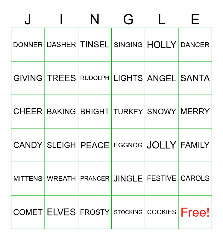 This bingo card has 42 words: COOKIES, TREES, PRESENTS, SNOWY, FAMILY, SLEIGH, CHEER, JOYFUL, TINSEL, MERRY, BRIGHT, LIGHTS, SANTA, HOLLY, ELVES, CANDY, CAROLS, ANGEL, Free!, DASHER, DANCER, PRANCER, MITTENS, DONNER, BLITZEN, COMET, RUDOLPH, RIBBON, WREATH, FESTIVE, CHIMNEY, TURKEY, GIVING, JOLLY, FROSTY, PEACE, EGGNOG, BAKING, JINGLE, STOCKING, SINGING and TWINKLE.