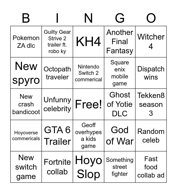 This bingo card has a free space and 24 words: GTA 6 Trailer, Fortnite collab, Nintendo Switch 2 commerical, New switch game, Witcher 4, Pokemon ZA dlc, New spyro, Guilty Gear Strive 2 trailer ft. robo ky, Ghost of Yotie DLC, Geoff overhypes a kids game, Square enix mobile game, New crash bandicoot, God of War, Random celeb, Octopath traveler, Something street fighter, Tekken8 season 3, KH4, Dispatch wins, Unfunny celebrity, Fast food collab ad, Hoyoverse commericals, Another Final Fantasy and Hoyo Slop.