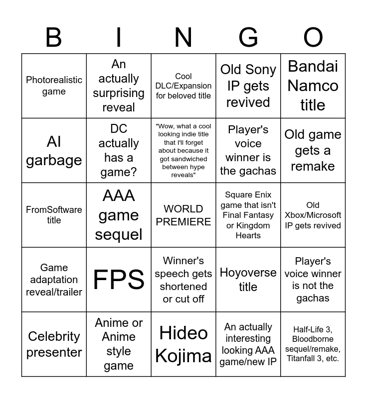 This bingo card has a free space and 24 words: FPS, Anime or Anime style game, "Wow, what a cool looking indie title that I'll forget about because it got sandwiched between hype reveals", Celebrity presenter, Bandai Namco title, Photorealistic game, AI garbage, An actually surprising reveal, Square Enix game that isn't Final Fantasy or Kingdom Hearts, Winner's speech gets shortened or cut off, Player's voice winner is the gachas, FromSoftware title, Hoyoverse title, Player's voice winner is not the gachas, DC actually has a game?, An actually interesting looking AAA game/new IP, Old Xbox/Microsoft IP gets revived, Cool DLC/Expansion for beloved title, Old game gets a remake, AAA game sequel, Half-Life 3, Bloodborne sequel/remake, Titanfall 3, etc., Game adaptation reveal/trailer, Old Sony IP gets revived and Hideo Kojima.
