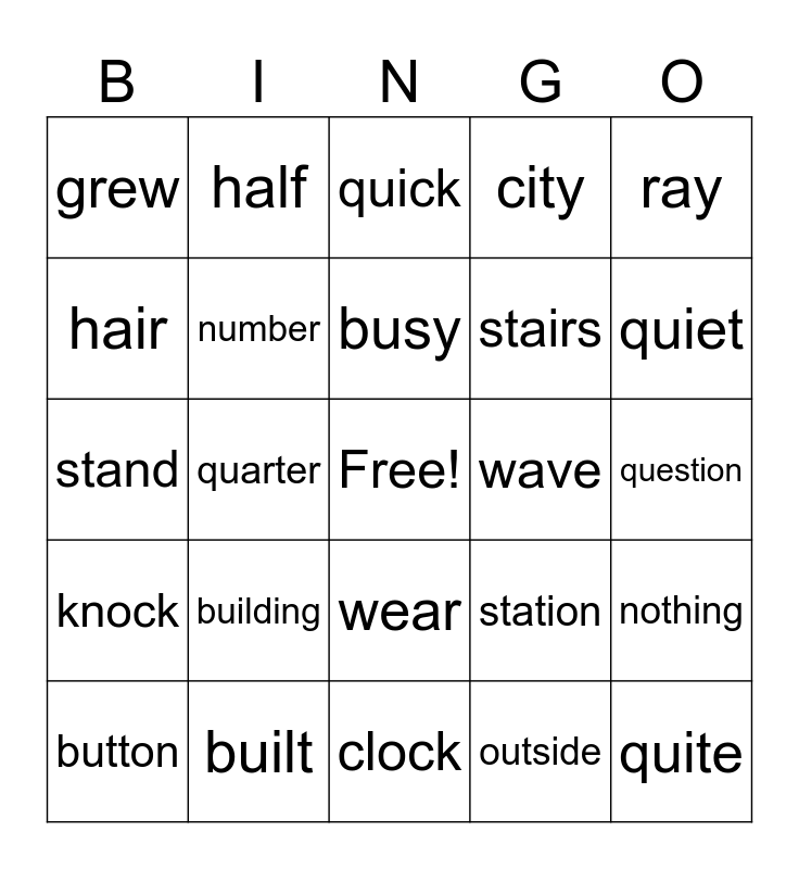 This bingo card has a free space and 24 words: building, built, busy, button, ray, grew, hair, half, wave, wear, stairs, stand, station, nothing, number, outside, question, quick, quiet, quarter, quite, knock, city and clock.