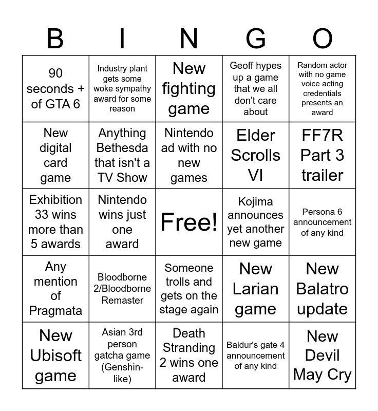 This bingo card has a free space and 24 words: Bloodborne 2/Bloodborne Remaster, Asian 3rd person gatcha game (Genshin-like), Nintendo ad with no new games, New Ubisoft game, Random actor with no game voice acting credentials presents an award, 90 seconds + of GTA 6, New digital card game, Industry plant gets some woke sympathy award for some reason, Kojima announces yet another new game, Someone trolls and gets on the stage again, Elder Scrolls VI, Exhibition 33 wins more than 5 awards, New Larian game, New Balatro update, Anything Bethesda that isn't a TV Show, Baldur's gate 4 announcement of any kind, Persona 6 announcement of any kind, New fighting game, FF7R Part 3 trailer, Nintendo wins just one award, New Devil May Cry, Any mention of Pragmata, Geoff hypes up a game that we all don't care about and Death Stranding 2 wins one award.