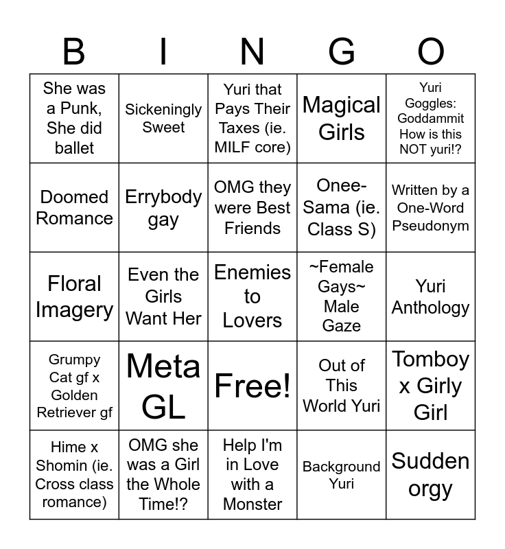 This bingo card has 26 words: Free!, Background Yuri, OMG they were Best Friends, OMG she was a Girl the Whole Time!?, Yuri Goggles: Goddammit How is this NOT yuri!?, She was a Punk, She did ballet, Doomed Romance, Sickeningly Sweet, Yuri Anthology, Out of This World Yuri, Onee-Sama (ie. Class S), Floral Imagery, Tomboy x Girly Girl, Hime x Shomin (ie. Cross class romance), Even the Girls Want Her, Skinship Grope, Magical Girls, Grumpy Cat gf x Golden Retriever gf, Yuri that Pays Their Taxes (ie. MILF core), Enemies to Lovers, Written by a One-Word Pseudonym, Help I'm in Love with a Monster, ~Female Gays~ Male Gaze, Meta GL, Errybody gay and Sudden orgy.
