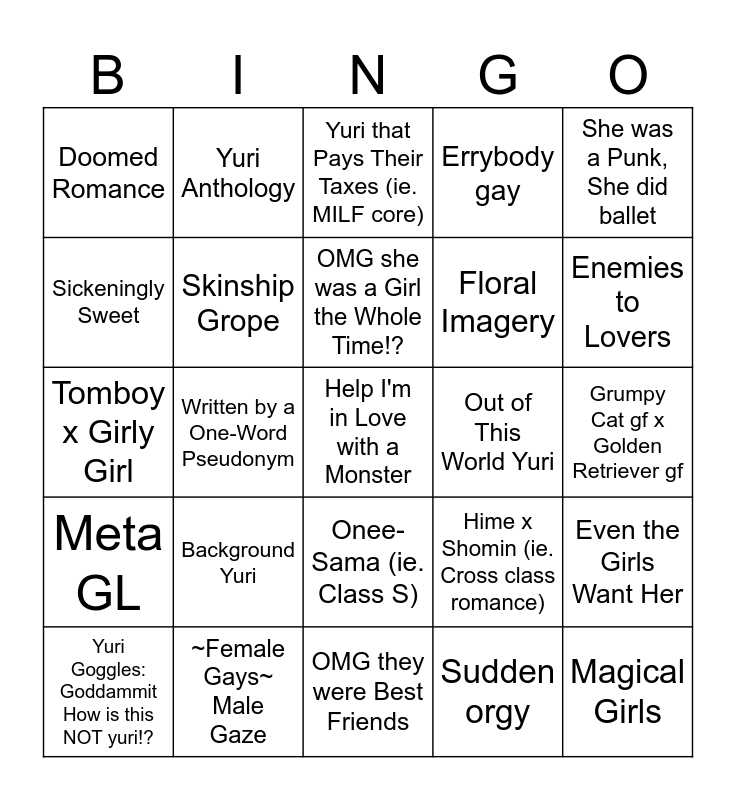 This bingo card has 25 words: Background Yuri, OMG they were Best Friends, OMG she was a Girl the Whole Time!?, Yuri Goggles: Goddammit How is this NOT yuri!?, She was a Punk, She did ballet, Doomed Romance, Sickeningly Sweet, Yuri Anthology, Out of This World Yuri, Onee-Sama (ie. Class S), Floral Imagery, Tomboy x Girly Girl, Hime x Shomin (ie. Cross class romance), Even the Girls Want Her, Skinship Grope, Magical Girls, Grumpy Cat gf x Golden Retriever gf, Yuri that Pays Their Taxes (ie. MILF core), Enemies to Lovers, Written by a One-Word Pseudonym, Help I'm in Love with a Monster, ~Female Gays~ Male Gaze, Meta GL, Errybody gay and Sudden orgy.