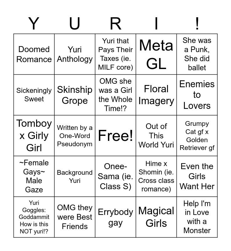 This bingo card has a free space and 24 words: Background Yuri, OMG they were Best Friends, OMG she was a Girl the Whole Time!?, Yuri Goggles: Goddammit How is this NOT yuri!?, She was a Punk, She did ballet, Doomed Romance, Sickeningly Sweet, Yuri Anthology, Out of This World Yuri, Onee-Sama (ie. Class S), Floral Imagery, Tomboy x Girly Girl, Hime x Shomin (ie. Cross class romance), Even the Girls Want Her, Skinship Grope, Magical Girls, Grumpy Cat gf x Golden Retriever gf, Yuri that Pays Their Taxes (ie. MILF core), Enemies to Lovers, Written by a One-Word Pseudonym, Help I'm in Love with a Monster, ~Female Gays~ Male Gaze, Meta GL and Errybody gay.