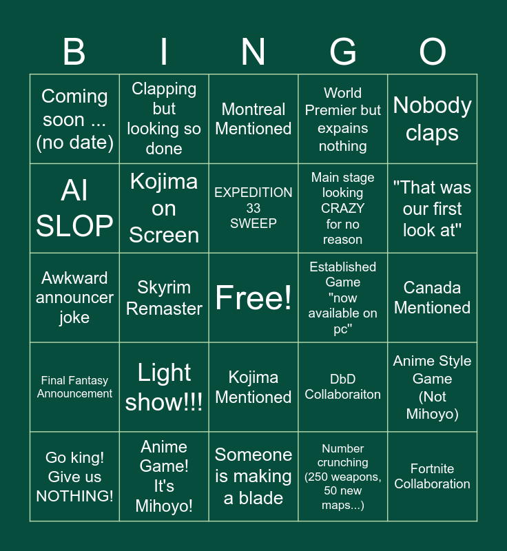This bingo card has a free space and 35 words: Joke met with silence, 5 minute speech, Muppets Show, Kojima on Screen, Kojima Mentioned, World Premier but expains nothing, AI SLOP, Releases TONIGHT or TOMORROW, EXPEDITION 33 SWEEP, HALF LIFE 3 CONFIRMED, Awkward announcer joke, Nobody claps, Audience cheers so much announcer can't speak, New online multiplayer pvp announced, Coming soon ... (no date), Established Game ''now available on pc'', Number crunching (250 weapons, 50 new maps...), Skyrim Remaster, Final Fantasy Announcement, Fortnite Collaboration, DbD Collaboraiton, Go king! Give us NOTHING!, Anime Style Game (Not Mihoyo), Anime Game! It's Mihoyo!, Montreal Mentioned, ''That was our first look at'', Create Environment Awareness, Pixel Game Announced, Main stage looking CRAZY for no reason, Canada Mentioned, Someones a little nakey, Someone is making a blade, Light show!!!, Clapping but looking so done and Hio mentions Chichi.