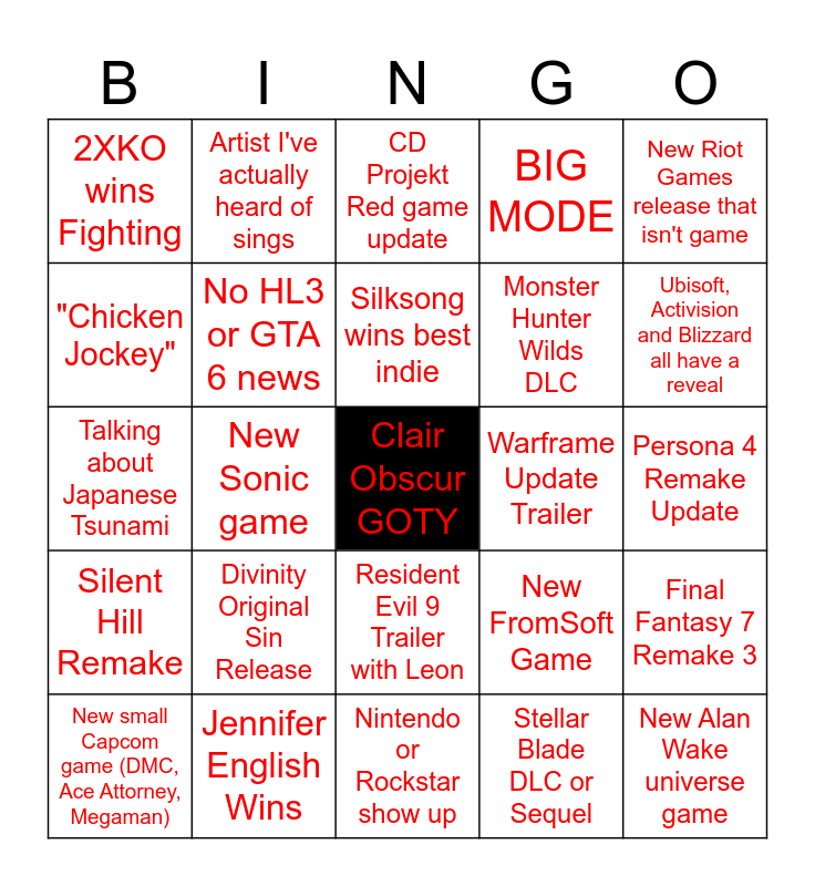 This bingo card has a free space and 24 words: Divinity Original Sin Release, Jennifer English Wins, Silksong wins best indie, New small Capcom game (DMC, Ace Attorney, Megaman), New Riot Games release that isn't game, 2XKO wins Fighting, "Chicken Jockey", Artist I've actually heard of sings, Warframe Update Trailer, Resident Evil 9 Trailer with Leon, Monster Hunter Wilds DLC, Talking about Japanese Tsunami, New FromSoft Game, Final Fantasy 7 Remake 3, No HL3 or GTA 6 news, Stellar Blade DLC or Sequel, Persona 4 Remake Update, CD Projekt Red game update, Ubisoft, Activision and Blizzard all have a reveal, New Sonic game, New Alan Wake universe game, Silent Hill Remake, BIG MODE and Nintendo or Rockstar show up.