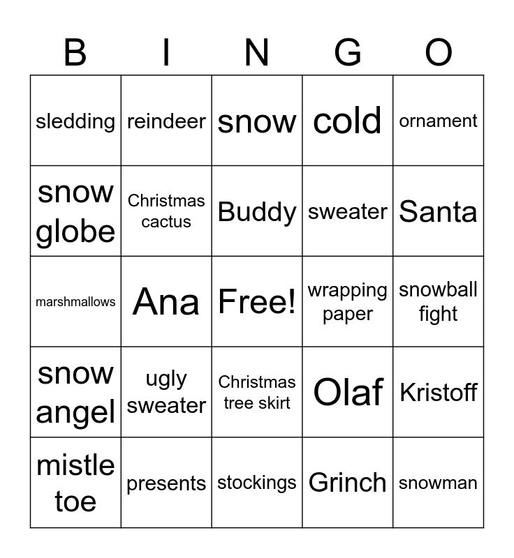 This bingo card has a free space and 43 words: Christmas tree, snowman, snowflake, mistle toe, lights, Grinch, snow, elf, ornament, presents, cold, wrapping paper, Christmas tree skirt, ugly sweater, white elephant, stockings, hot cocoa, marshmallows, candy cane, Santa, reindeer, carrots, Rudolph, sledding, skiing, snowball fight, Frozen, ice skating, Olaf, snow angel, Sven, Kristoff, Elsa, Ana, blizzard, clouds, Kevin (Home Alone), Buddy, snow globe, sweater, cookies, Christmas cactus and secret Santa.
