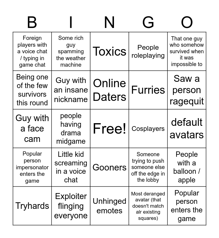 This bingo card has a free space and 24 words: Little kid screaming in a voice chat, Exploiter flinging everyone, Online Daters, Tryhards, That one guy who somehow survived when it was impossible to, Foreign players with a voice chat / typing in game chat, Being one of the few survivors this round, Some rich guy spamming the weather machine, Cosplayers, Gooners, Furries, Guy with a face cam, Someone trying to push someone else off the edge in the lobby, People with a balloon / apple, Guy with an insane nickname, Most deranged avatar (that doesn't match alr existing squares), default avatars, Toxics, Saw a person ragequit, people having drama midgame, Popular person enters the game, Popular person impersonator enters the game, People roleplaying and Unhinged emotes.
