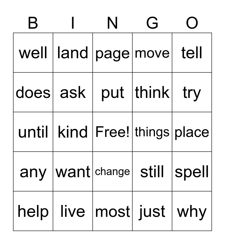 This bingo card has a free space and 24 words: want, live, put, help, tell, well, does, land, things, change, think, until, still, spell, ask, just, place, page, try, kind, why, any, move and most.