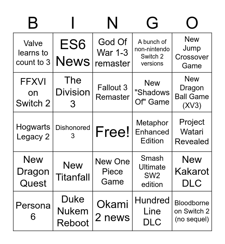 This bingo card has a free space and 24 words: New Titanfall, Duke Nukem Reboot, Fallout 3 Remaster, Persona 6, New Jump Crossover Game, Valve learns to count to 3, FFXVI on Switch 2, ES6 News, Metaphor Enhanced Edition, New One Piece Game, New "Shadows Of" Game, Hogwarts Legacy 2, Smash Ultimate SW2 edition, New Kakarot DLC, The Division 3, Hundred Line DLC, Project Watari Revealed, God Of War 1-3 remaster, New Dragon Ball Game (XV3), Dishonored 3, Bloodborne on Switch 2 (no sequel), New Dragon Quest, A bunch of non-nintendo Switch 2 versions and Okami 2 news.