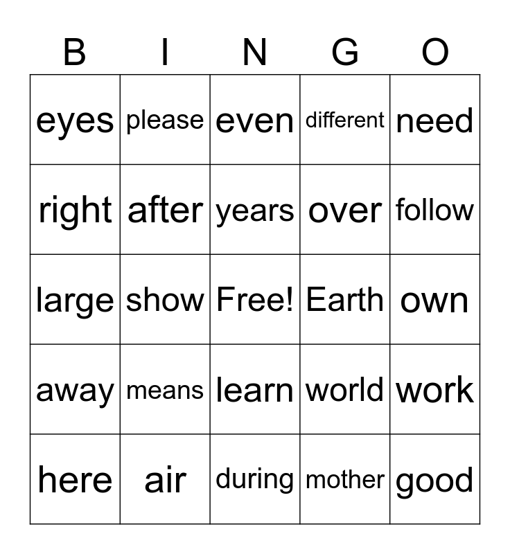 This bingo card has a free space and 24 words: means, air, years, here, need, eyes, right, please, Earth, learn, over, large, world, work, after, mother, own, even, follow, show, good, away, different and during.