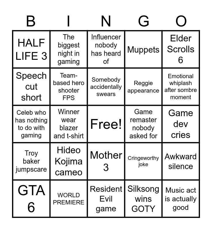 This bingo card has a free space and 24 words: Hideo Kojima cameo, WORLD PREMIERE, Somebody accidentally swears, GTA 6, Elder Scrolls 6, HALF LIFE 3, Speech cut short, The biggest night in gaming, Game remaster nobody asked for, Mother 3, Reggie appearance, Celeb who has nothing to do with gaming, Cringeworthy joke, Awkward silence, Team-based hero shooter FPS, Silksong wins GOTY, Game dev cries, Influencer nobody has heard of, Emotional whiplash after sombre moment, Winner wear blazer and t-shirt, Music act is actually good, Troy baker jumpscare, Muppets and Resident Evil game.