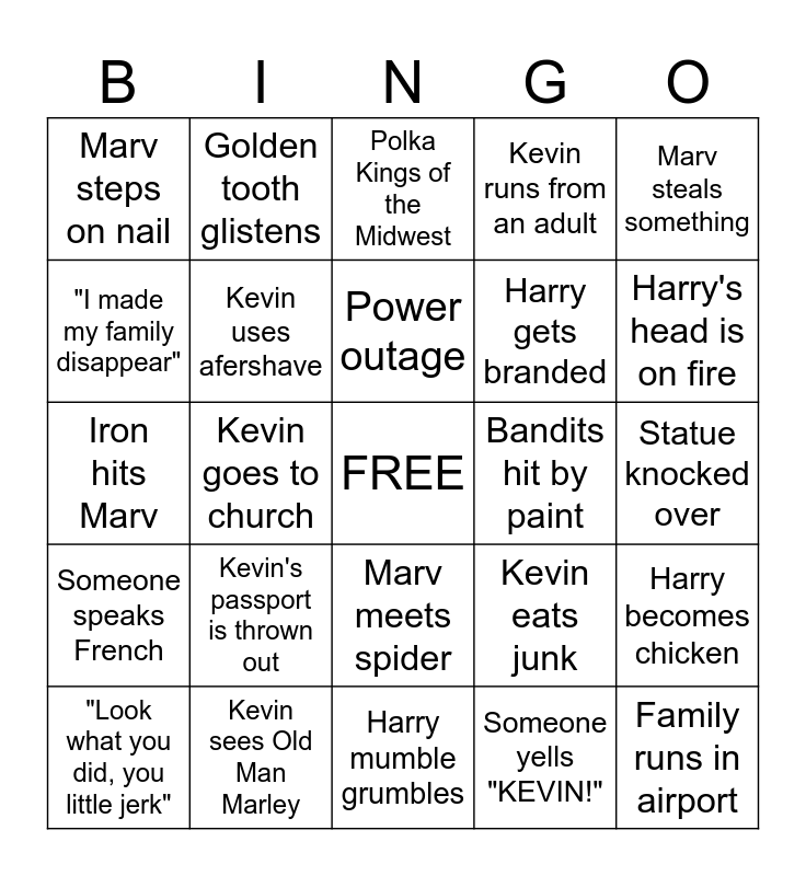 This bingo card has a free space and 29 words: "Look what you did, you little jerk", "Keep the change ya filthy animal", Kevin goes to church, It's snowing!, Marv steps on nail, Polka Kings of the Midwest, Kevin uses afershave, Kevin's passport is thrown out, Bandits hit by paint, Kevin sees Old Man Marley, Statue knocked over, Family runs in airport, Harry mumble grumbles, Someone yells "KEVIN!", Harry's head is on fire, Boiler comes "alive", Marv meets spider, Someone speaks French, Marv steals something, Iron hits Marv, Kevin eats junk, Kevin's bags break, Harry gets branded, "I made my family disappear", Kevin runs from an adult, Golden tooth glistens, Harry becomes chicken, Power outage and Kevin uses firecrackers.