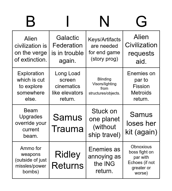 This bingo card has 16 words: Ridley Returns, Samus loses her kit (again), Keys/Artifacts are needed for end game (story prog), Alien civilization is on the verge of extinction., Beam Upgrades override your current beam., Galactic Federation is in trouble again., Stuck on one planet (without ship travel), Enemies as annoying as the ING return., Exploration which is cut to explore somewhere else., Long Load screen cinematics like elevators return., Ammo for weapons (outside of just missles/power bombs), Alien Civilization requests aid., Samus Trauma, Enemies on par to Fission Metroids return., Blinding Visors/lighting from structures/objects. and Obnoxious boss fight on par with Echoes (if not greater or worse).