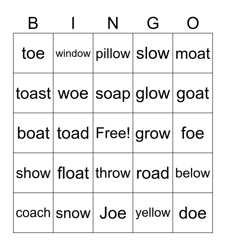 This bingo card has a free space and 24 words: float, snow, soap, coach, moat, toe, toast, window, grow, throw, glow, boat, road, below, woe, yellow, foe, pillow, goat, toad, doe, show, slow and Joe.