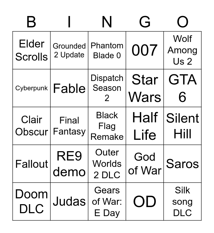 This bingo card has a free space and 24 words: RE9 demo, Judas, Dispatch Season 2, Doom DLC, Wolf Among Us 2, Elder Scrolls, Cyberpunk, Grounded 2 Update, Half Life, Outer Worlds 2 DLC, Star Wars, Clair Obscur, God of War, Saros, Fable, OD, Silent Hill, Phantom Blade 0, GTA 6, Final Fantasy, Silk song DLC, Fallout, 007 and Gears of War: E Day.