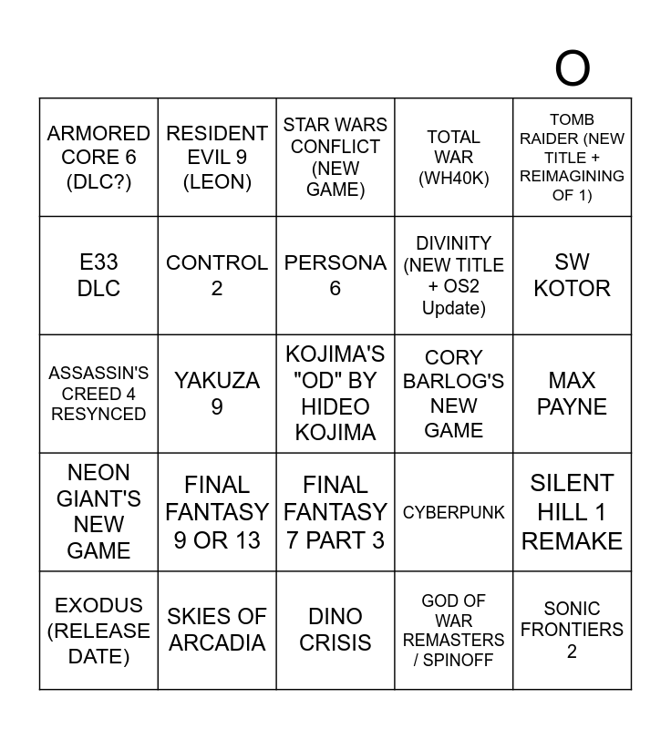 This bingo card has a free space and 24 words: FINAL FANTASY 9 OR 13, SKIES OF ARCADIA, PERSONA 6, EXODUS (RELEASE DATE), TOMB RAIDER (NEW TITLE + REIMAGINING OF 1), ARMORED CORE 6 (DLC?), E33 DLC, RESIDENT EVIL 9 (LEON), CORY BARLOG'S NEW GAME, FINAL FANTASY 7 PART 3, DIVINITY (NEW TITLE + OS2 Update), ASSASSIN'S CREED 4 RESYNCED, CYBERPUNK, SILENT HILL 1 REMAKE, CONTROL 2, GOD OF WAR REMASTERS / SPINOFF, MAX PAYNE, STAR WARS CONFLICT (NEW GAME), SW KOTOR, YAKUZA 9, SONIC FRONTIERS 2, NEON GIANT'S NEW GAME, TOTAL WAR (WH40K) and DINO CRISIS.