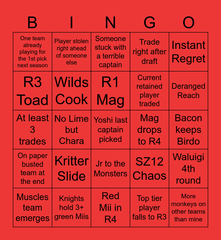 This bingo card has 25 words: Kritter Slide, Red Mii in R4, R1 Mag, Muscles team emerges, Instant Regret, One team already playing for the 1st pick next season, R3 Toad, Player stolen right ahead of someone else, Mag drops to R4, Jr to the Monsters, Current retained player traded, At least 3 trades, SZ12 Chaos, Waluigi 4th round, Wilds Cook, More monkeys on other teams than mine, Bacon keeps Birdo, Someone stuck with a terrible captain, Deranged Reach, No Lime but Chara, Yoshi last captain picked, Knights hold 3+ green Miis, On paper busted team at the end, Trade right after draft and Top tier player falls to R3.