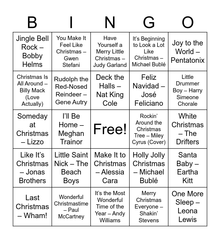 This bingo card has a free space and 57 words: All I Want for Christmas Is You – Mariah Carey, Last Christmas – Wham!, Rockin’ Around the Christmas Tree – Brenda Lee, Jingle Bell Rock – Bobby Helms, It’s the Most Wonderful Time of the Year – Andy Williams, White Christmas – Bing Crosby, Rudolph the Red-Nosed Reindeer – Gene Autry, I Saw Mommy Kissing Santa Claus – Jackson 5, Feliz Navidad – José Feliciano, The Christmas Song – Nat King Cole, It’s Beginning to Look a Lot Like Christmas – Michael Bublé, Let It Snow! Let It Snow! Let It Snow! – Frank Sinatra, Silver Bells – Dean Martin, Santa Tell Me – Ariana Grande, Underneath the Tree – Kelly Clarkson, Mistletoe – Justin Bieber, Joy to the World – Pentatonix, I’ll Be Home – Meghan Trainor, Santa’s Coming for Us – Sia, One More Sleep – Leona Lewis, Rockin’ Around the Christmas Tree – Miley Cyrus (Cover), Oh Santa! – Mariah Carey, Holly Jolly Christmas – Michael Bublé, Have Yourself a Merry Little Christmas – Judy Garland, Sleigh Ride – Ella Fitzgerald, Deck the Halls – Nat King Cole, Home for the Holidays – Perry Como, Have a Holly Jolly Christmas – Burl Ives, Little Drummer Boy – Harry Simeone Chorale, Happy Holiday – Andy Williams, Somewhere in My Memory – John Williams, Carol of the Bells – Home Alone Choir, Run Rudolph Run – Chuck Berry, Sleigh Ride – The Ronettes, White Christmas – The Drifters, Christmas Is All Around – Billy Mack (Love Actually), Have Yourself a Merry Little Christmas – Sam Smith, Someday at Christmas – Lizzo, Merry Christmas – Ed Sheeran & Elton John, Like It’s Christmas – Jonas Brothers, You Make It Feel Like Christmas – Gwen Stefani, Make It to Christmas – Alessia Cara, Mary, Did You Know? – Pentatonix, O Holy Night – Nat King Cole, Jingle Bells – Frank Sinatra, Here Comes Santa Claus – Gene Autry, Little Saint Nick – The Beach Boys, Wonderful Christmastime – Paul McCartney, What Christmas Means to Me – Stevie Wonder, Step Into Christmas – Elton John, Driving Home for Christmas – Chris Rea, Merry Christmas Everyone – Shakin’ Stevens, 2000 Miles – The Pretenders, Santa Claus Is Coming to Town – Michael Bublé, Christmas (Baby Please Come Home) – Darlene Love, Santa Baby – Eartha Kitt and Christmas (Baby Please Come Home) – U2 (Cover).