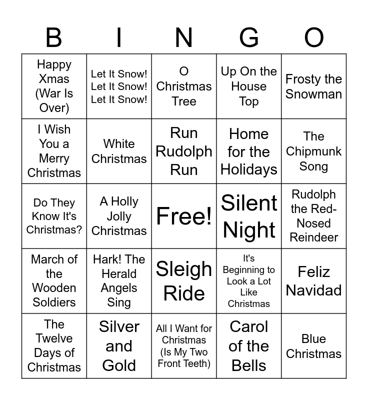 This bingo card has a free space and 66 words: It's the Most Wonderful Time of the Year, Last Christmas, Have Yourself a Merry Little Christmas, Feliz Navidad, Grandma Got Run Over by a Reindeer, Rockin' Around the Christmas Tree, Let It Snow! Let It Snow! Let It Snow!, All I Want for Christmas Is You, Run Rudolph Run, Deck The Hall, Sleigh Ride, Santa Baby, Rudolph the Red-Nosed Reindeer, Frosty the Snowman, Mistletoe, I Wish You a Merry Christmas, A Holly Jolly Christmas, Happy Xmas (War Is Over), Hey Santa Claus, Home for the Holidays, Hark! The Herald Angels Sing, March of the Wooden Soldiers, Up On the House Top, This Christmas, Mele Kalikimaka, I Want a Hippopotamus for Christmas, Do You Hear What I Hear?, You're a Mean One, Mr. Grinch, Blue Christmas, I Saw Mommy Kissing Santa Claus, The Twelve Days of Christmas, Dominick the Donkey, Joy to the World, Baby, It's Cold Outside, It's Beginning to Look a Lot Like Christmas, Silver and Gold, Christmas (Baby Please Come Home), Do They Know It's Christmas?, Carol of the Bells, Santa Claus Is Comin' to Town, White Christmas, Jingle Bells, Silent Night, Christmas Time Is Here, Caroling, Caroling, Underneath the Tree, The Chipmunk Song, Winter Wonderland, Dance of the Sugar Plum Fairy, The Christmas Song, Here Comes Santa Claus, Wonderful Christmastime, Where Are You Christmas, Christmas Eve/Sarajevo 12/24, Silver Bells, Merry Christmas Darling, The First Noël, Little Saint Nick, O Christmas Tree, All I Want for Christmas (Is My Two Front Teeth), Santa Tell Me, I'll Be Home for Christmas, Jingle Bell Rock, Mi Burrito Sabanero, Noche de Paz and El Año Viejo.