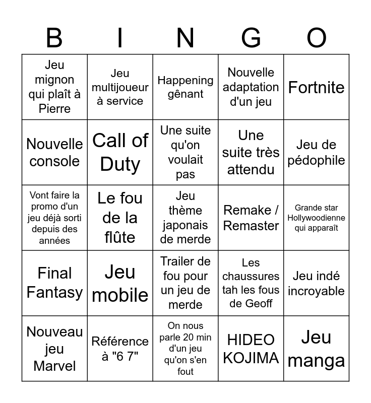 This bingo card has a free space and 24 words: Jeu mobile, Référence à "6 7", Une suite qu'on voulait pas, Nouveau jeu Marvel, Fortnite, Jeu mignon qui plaît à Pierre, Nouvelle console, Jeu multijoueur à service, Remake / Remaster, Trailer de fou pour un jeu de merde, Une suite très attendu, Vont faire la promo d'un jeu déjà sorti depuis des années, Les chaussures tah les fous de Geoff, Jeu indé incroyable, Call of Duty, HIDEO KOJIMA, Grande star Hollywoodienne qui apparaît, Happening gênant, Jeu de pédophile, Le fou de la flûte, Jeu manga, Final Fantasy, Nouvelle adaptation d'un jeu and On nous parle 20 min d'un jeu qu'on s'en fout.