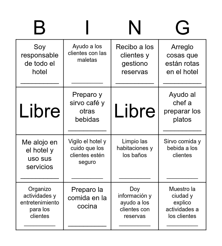 This bingo card has 16 words: Preparo la comida en la cocina __________, Sirvo comida y bebida a los clientes __________, Recibo a los clientes y gestiono reservas __________, Soy responsable de todo el hotel __________, Me alojo en el hotel y uso sus servicios __________, Ayudo a los clientes con las maletas __________, Limpio las habitaciones y los baños __________, Doy información y ayudo a los clientes con reservas __________, Libre, Preparo y sirvo café y otras bebidas __________, Organizo actividades y entretenimiento para los clientes __________, Arreglo cosas que están rotas en el hotel __________, Vigilo el hotel y cuido que los clientes estén seguro __________, Ayudo al chef a preparar los platos __________, Libre and Muestro la ciudad y explico actividades a los clientes __________.