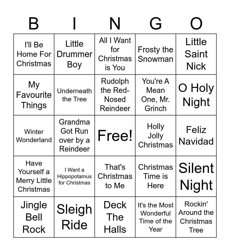 This bingo card has a free space and 29 words: Jingle Bell Rock, Santa Baby, Grandma Got Run over by a Reindeer, Last Christmas, I'll Be Home For Christmas, All I Want for Christmas is You, Underneath the Tree, I Want a Hippopotamus for Christmas, Holly Jolly Christmas, Sleigh Ride, Feliz Navidad, Rockin' Around the Christmas Tree, Deck The Halls, It's the Most Wonderful Time of the Year, O Holy Night, Let it Snow!, That's Christmas to Me, Have Yourself a Merry Little Christmas, Little Saint Nick, Winter Wonderland, Christmas Time is Here, We Wish You A Merry Christmas, You're A Mean One, Mr. Grinch, My Favourite Things, Frosty the Snowman, Little Drummer Boy, Silent Night, Rudolph the Red-Nosed Reindeer and Santa Claus is Coming to Town.