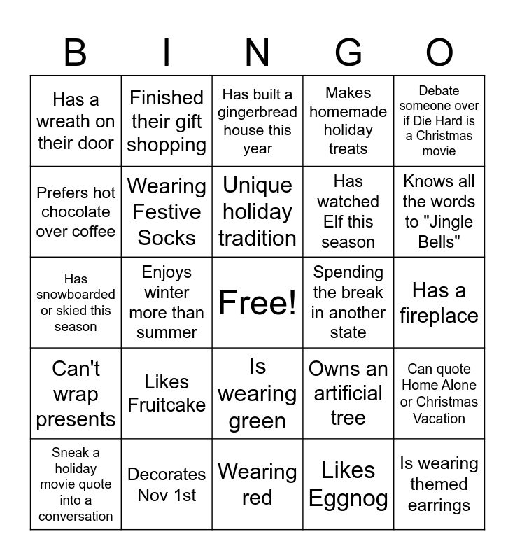 This bingo card has a free space and 34 words: Get Jay to say the word "________", Likes Eggnog, Find a hidden candy cane, "Ugly" Sweater, Can't wrap presents, Wearing Festive Socks, Debate someone over if Die Hard is a Christmas movie, Sneak a holiday movie quote into a conversation, Finished their gift shopping, Can name all of Santa's Reindeer, Unique holiday tradition, Has built a gingerbread house this year, Puts a stocking up for a pet, December birthday, Spending the break in another state, Knows all the words to "Jingle Bells", Decorates Nov 1st, Has snowboarded or skied this season, Likes Fruitcake, Owns an artificial tree, Is wearing green, Has been on a sleigh ride, Has a wreath on their door, Has a fireplace, Wearing red, Is wearing themed earrings, Makes homemade holiday treats, Owns a themed onesie, Has watched Elf this season, Prefers hot chocolate over coffee, Gone ice skating, Enjoys winter more than summer, Can quote Home Alone or Christmas Vacation and Watches the Rose Parade/Rose Bowl.