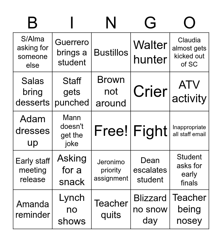 This bingo card has a free space and 31 words: Teacher quits, Teacher breakdown, Mann doesn't get the joke, Someone falls in the snow/ice, S/Alma asking for someone else, Bustillos, Staff gets punched, Dean escalates student, Fight, Blizzard no snow day, Inappropriate all staff email, Teacher being nosey, Wrong Mexican, Dog Chase, ATV activity, End of day Fire drill, Student asks for early finals, Asking for a snack, Early staff meeting release, Jeronimo priority assignment, Claudia almost gets kicked out of SC, 3x announcement failure, Amanda reminder, Guerrero brings a student, Crier, Salas bring desserts, Walter hunter, Adam dresses up, Lynch no shows, Brown not around and Teacher thinking they're funny.